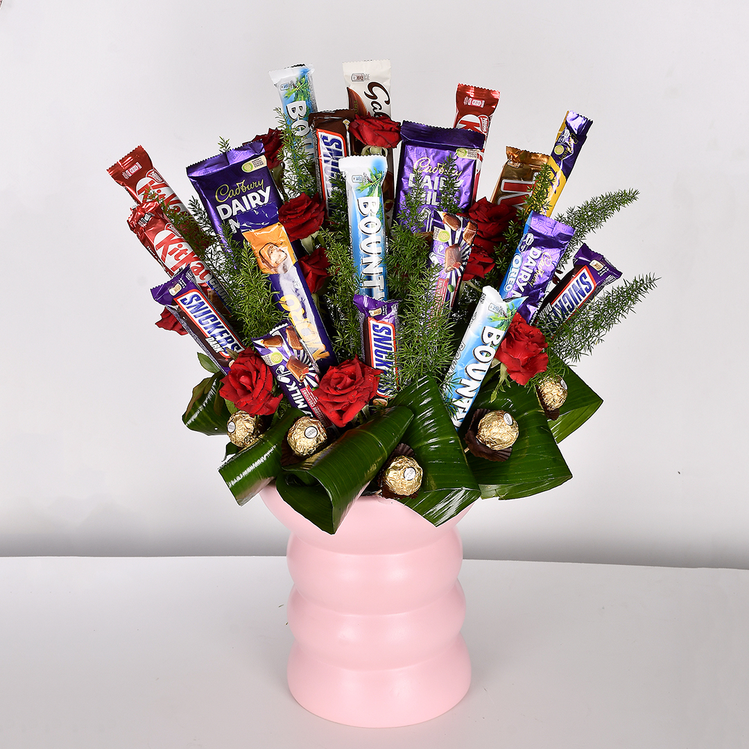 A vase filled with flowers and a sweet touch of chocolates for extra joy.